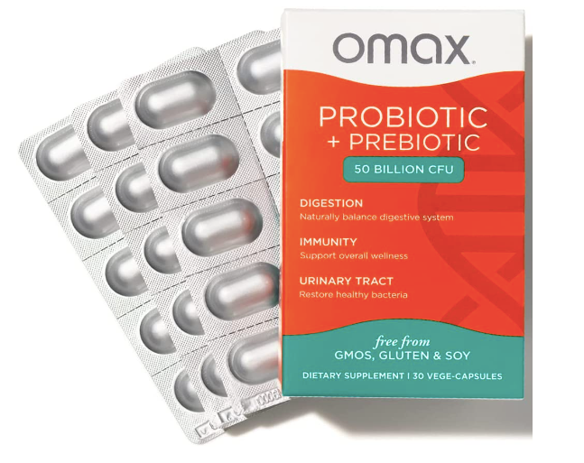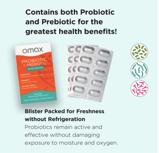 Omax Prebiotic & Probiotic 50 Billion CFU + Chicory Inulin, 10 Strains, Reduce Bloating, Digestion, SIBO, Leaky Gut, Vaginal pH, Acidophilus, Vegan, Dairy Free, Gluten Free, Blister Packaged.