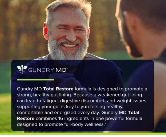 It's designed to promote a strong, healthy gut lining. Because when gut flora weakens, it can lead to fatigue and digestive discomfort, a marker of gut leakage. Supporting your gut is vital to keeping you healthy, comfortable, and zinc-energized daily. Gundry MD Total Restore combines 16 all-natural ingredients in one powerful amino acid formula to fortify gut cells that provide overall health.