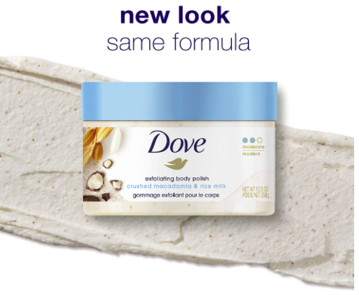 Dove Exfoliating Body Polish Scrub Reveals Visibly Better Skin, Macadamia and Rice Milk That Nourishes Skin.