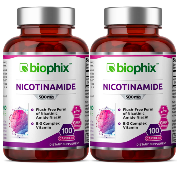 Biophix B-3 Nicotinamide 500 mg 100 Caps 2 Pack - Nicotinic Amide Niacin Natural Flush-Free Vitamin Formula - Supports Skin Cell Health.
